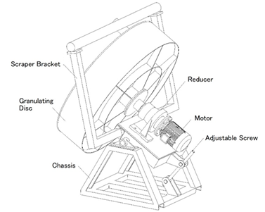 The equipment is composed of a granulation disc, a driving device, an angle adjustment support device and a spraying device, with simple structure, convenient operation and low maintenance cost.
