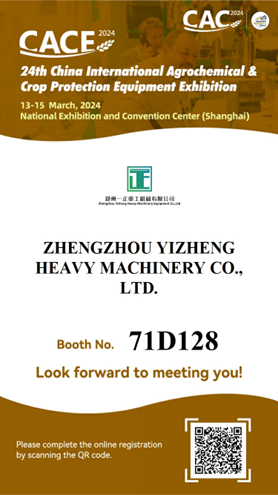 Zhengzhou Yizheng Heavy Machinery Equipment Co., Ltd. cordially invites you to participate in the 24th China International Agricultural Chemicals and Crop Protection Equipment Exhibition (CACE2024). The event will take place at the Shanghai National Exhibition and Convention Center from March 13 to 15, 2024. We look forward to engaging with you to enhance industry exchange, expand business cooperation, and contribute to the global fertilizer industry’s development!